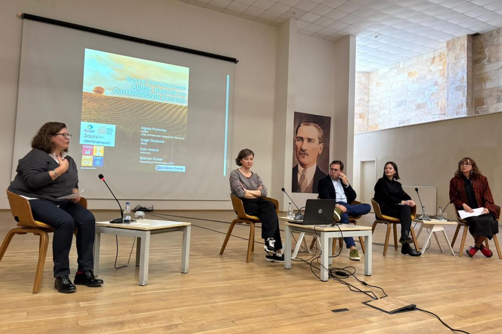 Panelde, sosyal inovasyonun kültür ve gastronomi ile kesiştiği noktalar, yerel bağcılık pratiklerinin sürdürülebilirliği, gastronomi üzerinden kültürel değerlerin aktarımı ve inovatif iş birliği modelleri ele alındı. KÜSİF Direktörü Gonca Ongun’un moderatörlüğünde gerçekleşen etkinlikte Agata Fortuna (KÜSİF), Çağıl Özdemir (3dots), Can Atacık (Alethina) ve Şükran Ünser (KAM) konuşmacı olarak yer aldı.